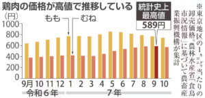 2年前に1キロ396円だったむね肉の卸売価格は、今年に入って400円を超え、9月には589円。過去最高値です。